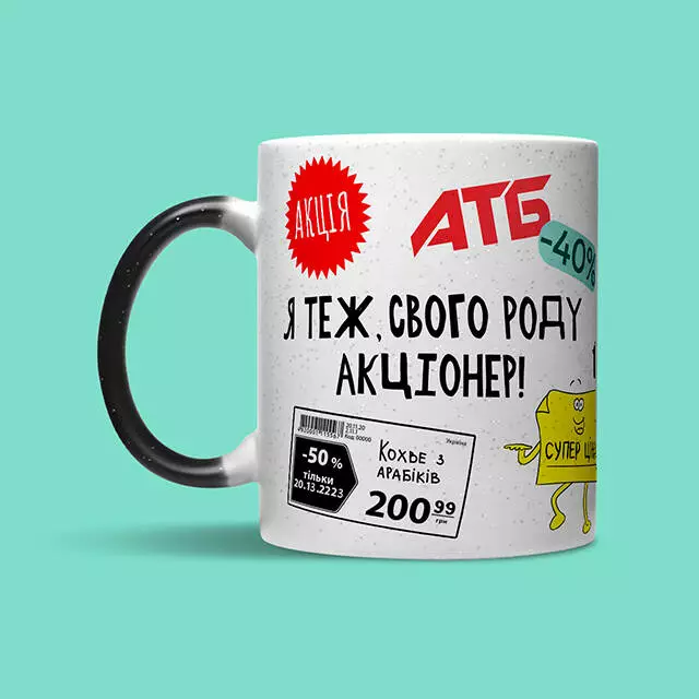 Всі ми в своєму роді "акціонери" компаній АТБ та Сільпо, адже дуже любимо так скуплятись, то є так? Ну що тут скажеш, любимо ціну тижня, гречаний багетик і сирочки з АТБ мммм. Головне про кружку: • Матеріал - кераміка; • Спосіб нанесення напису - сублімація; • Об'єм - 320 мл; • Призначення - для чаю, кави, води або інших напоїв; УВАГА! Ми не рекомендуємо мити кружку в посудомийній машині та нагрівати у мікрохвильовці, щоб не пошкодити принт.