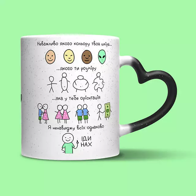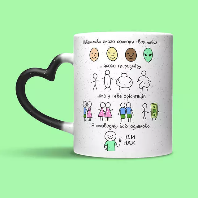 ???? Кружка "Іди Н*Х" - ідеальний подарунок для твоїх друзів, колег та членів родини! ???? Шукаєте чудовий подарунок для своїх друзів, колег або рідних? Тоді кружка "Іди Н*Х" - це те, що вам потрібно! Ця кружка створена для тих, хто має почуття гумору і цінує позитивну атмосферу. Завдяки своєму незвичайному напису, вона може стати улюбленою кружкою для вечірнього чаювання або надати вашим перервам на каву додаткові розмірковування. Звісно, що важливо зберігати спокій та відпочинок у нашому житті, та з цію чашкою усмішка буде у кожного, хто проводть з Вами вечори або обідню перерву. Не втрачайте нагоди подарувати усмішку та позитивну енергію своїм близьким з кружкою "Іди Н*Х". Зробіть собі або комусь особливий подарунок, який нагадуватиме про важливість гумору та насолоди у житті. Основні характеристики кружки: ???? Матеріал: високоякісна кераміка. ???? Спосіб нанесення напису: сублімаційний друк, що гарантує стійкість зображення. ???? Об'єм: 320 мл - ідеальний розмір для твоєї улюбленої кави, чаю або будь-якого іншого напою. ???? Використання: кружка призначена для повсякденного використання з будь-якими напоями - вода, сік, гарячі та холодні напої. ❗️ Зверни увагу! Намагайся уникати миття кружки в посудомийній машині та нагрівання її у мікрохвильовці. Це допоможе зберегти яскравість та довговічність принта. ???????? Обери кружку "Іди Н*Х" і порадуй своїх близьких або колег чудовим подарунком на день народження, 8 березня, день захисника та інші свята. Замовляй зараз та насолоджуйся моментами з важливим позитивним підтекстом в кожному ковтку! ????????✨