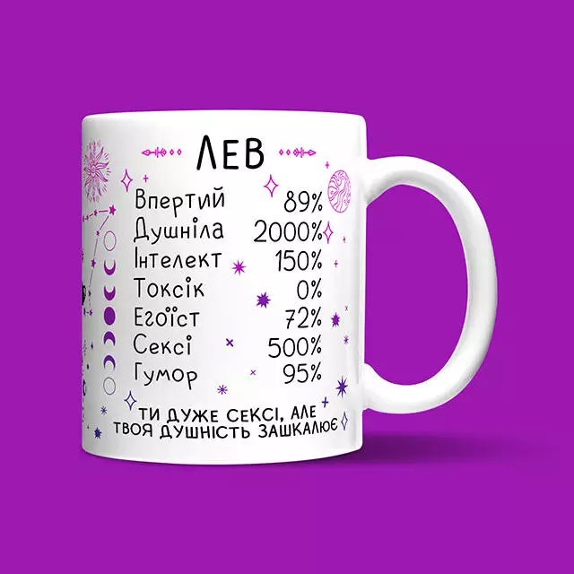 ???? Зустрічайте нову кружку "Лев" - ідеальний подарунок для всіх, хто обожнює гороскопи! ???? Ця кружка стане прекрасним подарунком для ваших друзів, колег або членів сім'ї. Вона особливо підійде тим, хто має чудове почуття гумору і цінує позитивну атмосферу. Завдяки кружці "Лев" ви зможете насолоджуватись вечорами, сидячи з чаєм, або засмагати в розмірковуваннях під час перерви на каву. Ця кружка стане вашою улюбленою компанією, даруючи вам радість і комфорт. Зробіть собі або комусь особливий подарунок, який завжди нагадуватиме про важливість збереження спокою і відпочинку у житті. Кружка "Лев" - це більше, ніж звичайна посудина, вона стає символом вашої особистості і унікального стилю. Основні характеристики кружки: ???? Матеріал: високоякісна кераміка. ???? Спосіб нанесення напису: сублімаційний друк, що гарантує стійкість зображення. ???? Об'єм: 320 мл - ідеальний розмір для твоєї улюбленої кави, чаю або будь-якого іншого напою. ???? Використання: кружка призначена для повсякденного використання з будь-якими напоями - вода, сік, гарячі та холодні напої. ❗️ Зверни увагу! Намагайся уникати миття кружки в посудомийній машині та нагрівання її у мікрохвильовці. Це допоможе зберегти яскравість та довговічність принта. ???????? Обери кружку "Лев" і порадуй своїх близьких або колег чудовим подарунком на день народження, 8 березня, день захисника та інші свята. Замовляй зараз та насолоджуйся моментами з важливим позитивним підтекстом в кожному ковтку! ????????✨