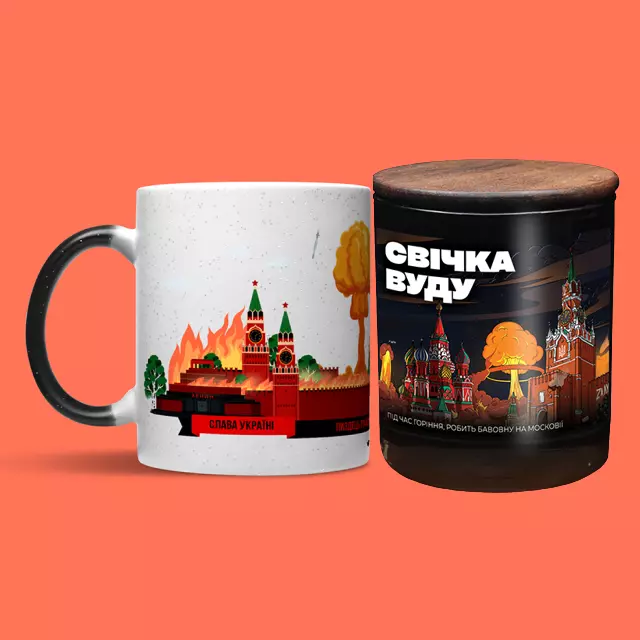 Горить палає московія на болотах, ось так ми вирішили охрестити цей комбо набір "Русофобія ХУЄМЛЬ Вуду" від Чайника Рассела ???????? Чашка хамелеон: • Матеріал – кераміка; • Спосіб нанесення напису – сублімація; • Об’єм – 320 мл; • Призначення – для чаю, кави, води або інших напоїв; УВАГА! Ми не рекомендуємо мити кружку в посудомийній машині та нагрівати у мікрохвильовці, щоб не пошкодити принт. Свічка парфумована: Комплектація: Скло+дерев’яна кришка Колір баночки: тоноване чорне скло Колір дерев’яної кришки: темно-коричневий Склад свічки: 185 грамів воску, ароматизатор. Аромат: Paradise Crush Час горіння: 35 годин
