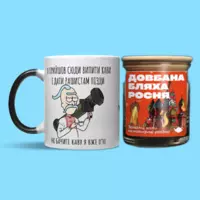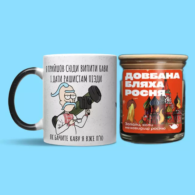 Горить палає московія на болотах, ось так ми вирішили охрестити цей комбо набір "Русофобія Ріка Бавовна" від Чайника Рассела ???????? Чашка хамелеон: • Матеріал – кераміка; • Спосіб нанесення напису – сублімація; • Об’єм – 320 мл; • Призначення – для чаю, кави, води або інших напоїв; УВАГА! Ми не рекомендуємо мити кружку в посудомийній машині та нагрівати у мікрохвильовці, щоб не пошкодити принт. Свічка парфумована: Комплектація: Скло+дерев’яна кришка Колір баночки: тоноване чорне скло Колір дерев’яної кришки: темно-коричневий Склад свічки: 185 грамів воску, ароматизатор. Аромат: Paradise Crush Час горіння: 35 годин
