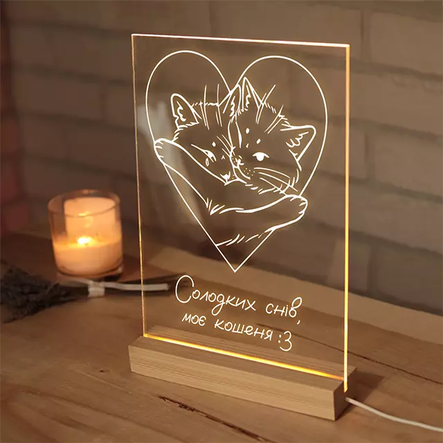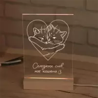 Чайник Рассела продовжує створювати неймовірні подарунки для вас! Це просто маленьке диво. Нічник, який ти не захочеш вимикати! Сучасна та об'ємна 3D-лампа стане незамінним помічником для тих, хто обожнює насолоджуватися довгими ночами та приємними вечорами. Такий подарунок принесе максимум користі та приємних вражень, а оригінальні чуттєві та затишні дизайни багато розкажуть про ваші почуття. Інформація про нічник: Матеріал: акрил (товщина - 3 мм); Тип підключення USB; Колір підсвітки - теплий білий; Тип підсвітки - Led; Матеріал корпусу - соснова деревина; Потужність: 3-3,5W